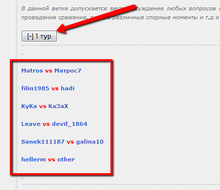 Чтобы зафиксировать свою победу, победитель после проведенного боя, обязательно должен в этой теме сообщить об этом с предоставлением ссылки на свой профиль. После проверки факта победы, победитель попадает в следующий тур. Ни в коем случае не проводите никаких боев, пока факт победы не будет проверен и зафиксирован, в противном случае ваша победа не будет засчитана (так как в истории профиля не будет данных о ней).