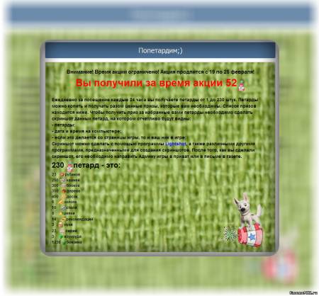 Мы решили всех пользователей нашей игры в очередной раз порадовать и к 23 февраля вводим игру "Попетардим;)". Игра расположена в приложении бонусные игры, под игрой на сайте и на странице с морским боем! Приятной игры!